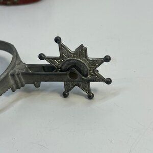 These straps are perfect for display or functional use in rodeo or equestrian events. The straps are in good vintage condition with some signs of use, which adds to their character. The spurs have a sturdy build with a traditional design. Each strap measures approximately 8 inches in length. A unique and eye-catching piece of western heritage.
