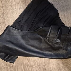 Stylish black leather vest featuring adjustable side straps. Perfect for a bold look.