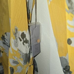 Chic floral blouse by Jennifer Lopez. Features a mustard yellow base with gray floral patterns. Perfect for casual or dressy occasions.