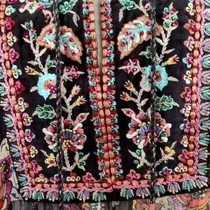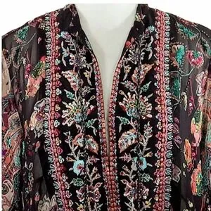 bohemian style sheer blouse featuring intricate floral embroidery and shimmery sequin accents. Wear over your favorite camisole.