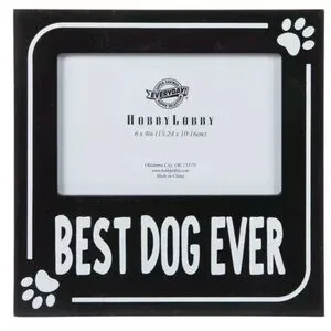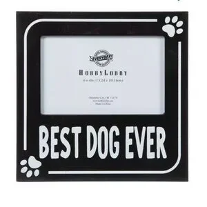Tabletop Frame. It features a black MDF frame and a glass panel on the front. Around the frame are white lines and paw prints and the phrase "Best Dog Ever" at the bottom.