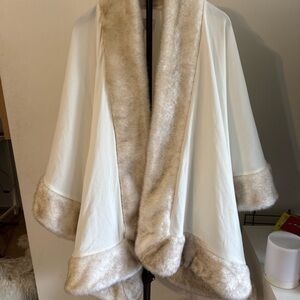 Chic poncho with soft cream fabric. Accented by plush tan faux fur trim. Ideal for a stylish, cozy look.