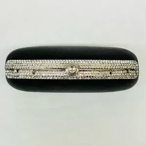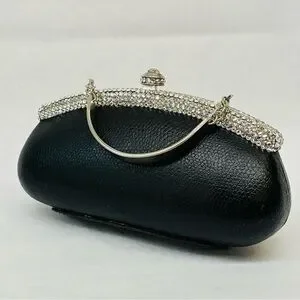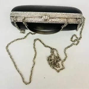 Perfect for you dressy evening out. Nubbly faux leather outside with crystal clasp and embellishment. You can tuck the chain and handle inside to carry as a tiny clutch or use the small handle or use the chain (23” drop) to carry on your shoulder or as a cross-body. So many choices! This comes with a storage bag and the original box. It may have been used once or twice for a very special occasion but has been very well cared for. At first I thought there were four crystals missing but, no! Those are the spots where the handle and chain attach. Push the large crystal catch down to open the purse.