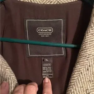 Classic trench coat with a herringbone pattern. Features a tailored fit and button closure. Ideal for stylish layering.