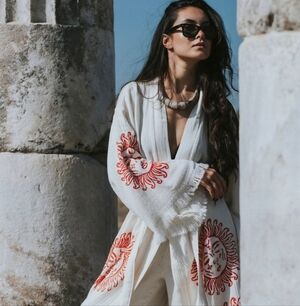 Elevate your home decor with this elegant white kimono featuring striking red sun motifs. Perfect for adding a touch of artistic flair to any room.