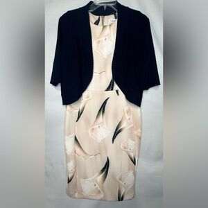 Elegant Calvin Klein Calla Lilly sleeveless dress paired with a Cable & Gage black cardigan. Perfect for Easter, Work, Vacation, or any special occasion