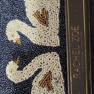 ( LOOK THESE UP! THIS IS A SMOKIN DEAL! BUT WILL BE GONE SOON!) ❤️😊🌻 THANK YOU) 1.) new in box, without tags attached!, beaded, in navy blue with two white swans on the front, clutch handle, with a 24in. shoukder or crossbody purse, can revove gold sparkly chain and use as a clutch. 9x7x2 . by "Rachel Zoe" Los Angeles New York. Made very well!! classy!!