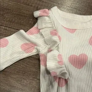Adorable baby romper with pink heart pattern. Includes matching headband. Ruffled sleeves and button closure at the bottom for easy diaper changes. No rips or stains.