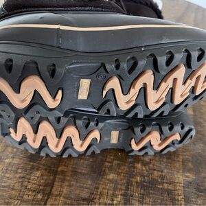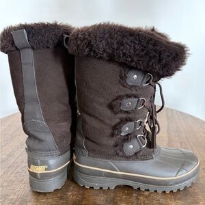 Cozy black boots with fur trim. Ideal for winter weather. Durable and stylish design.
