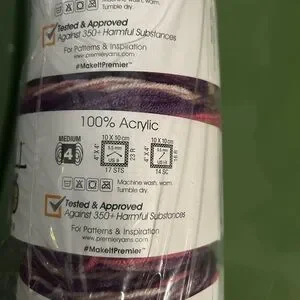 Soft acrylic yarn with pink and purple tones. Ideal for crafting projects.