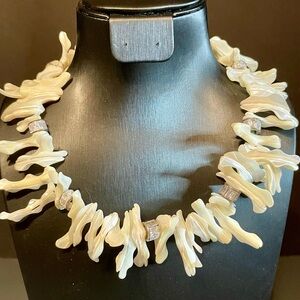 Rare Otazu mother-of-pearl statement collar necklace. It features a slight chunky design characterized by irregular, curved branch-like pieces of polished mother-of-pearl shell.