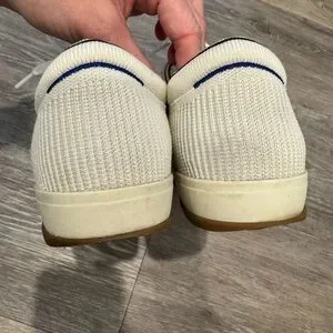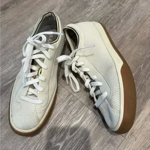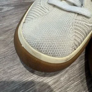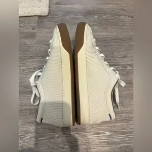Rothy's The Lace Up sneakers in a cream/vanilla color with gum outsoles. Size 8 (women’s.) originally $149. Some small dirt spots throughout but would likely come out with a thorough washing.
