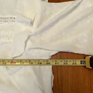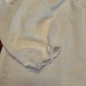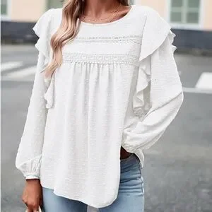 NWT Flirty top with long sleeves, ruffles around the shoulders, back key hole opening and a polyester Swiss dot like material. Brand new, excellent condition. Measurements in the photos. Size large. From a smoke free, pet friendly home.
