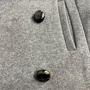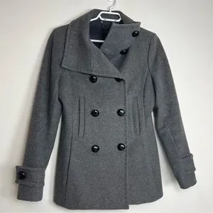 Features: Double-breasted closure, vertical welt pockets, button-tab cuffs, and a fully lined interior.
