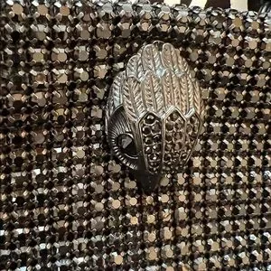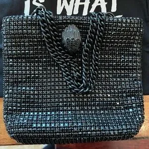 Chic black bag with shimmering details. Features a bold chain fancy carry handle. Perfect for evening outings, church, weddings, dinner out, etc. Definitely will hold your essentials. These bags are so beautiful and so well-made. Very striking!Bag size is 7 x 6.