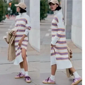 Daily Practice by Anthropologie sweater dress features a cozy turtleneck and a vibrant striped pattern in purple, orange, and white. This midi-length knit piece is designed with a relaxed, oversized fit and dropped shoulders for ultimate comfort. The soft acrylic blend fabric provides warmth without bulk, making it a perfect choice for transitional weather or layering. A side slit adds a touch of modern flair and ease of movement to this effortless pullover style.