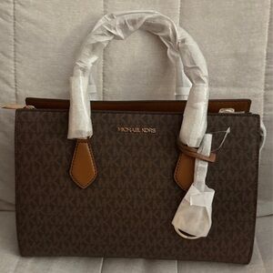 Chic Michael Kors satchel in brown and tan. Perfect for everyday elegance. Features signature logo charm.