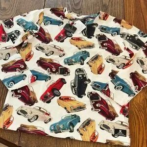 Long sleeve tee with colorful classic car print. Features red, blue, and tan cars. Fun and stylish for kids.