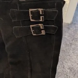 Elegant black suede boots with bold buckle accents. Perfect for a stylish touch. Gently worn.