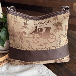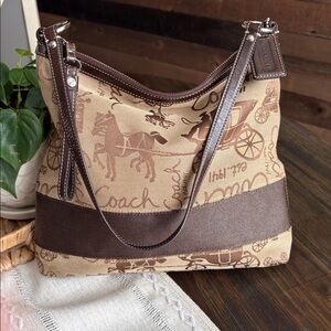 Elegant Coach Vintage Horse and Carriage bag with signature print. Features rich brown accents. Ideal for versatile styling. This bag is in Excellent condition. Please see photos as they part of the description. Price is firm. Adorable bag. 💕