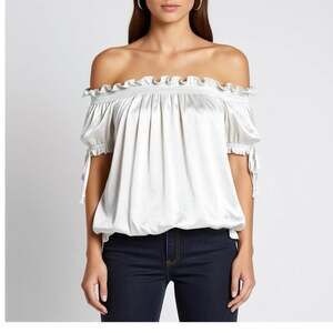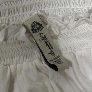 American Rag Women's Off-The-Shoulder Ruffle Smocked Peasant Blouse, White, Size Medium. This elegant boho-chic top features a smocked off-the-shoulder neckline with feminine ruffle trim. Designed with short puff sleeves featuring adjustable tassel tie details for a custom look. Brand new with tags attached ($29.50 MSRP). Perfect for summer outings, festivals, or casual styling with jeans. Lightweight, breathable fabric in a crisp white 'Egret' colorway. Excellent condition with no flaws.
