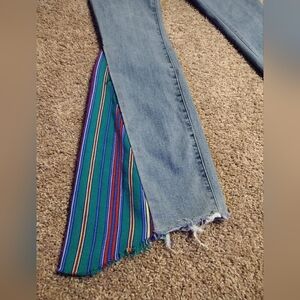 Prana Bell-bottom wide flare denim jeans, featuring vibrant multicolor stripes. Women's size 8/29 tall jeans. Inseam measures 31" and Bell-bottom measures 11.5". Perfect for adding a pop of color to your wardrobe. All questions welcome!