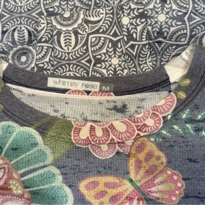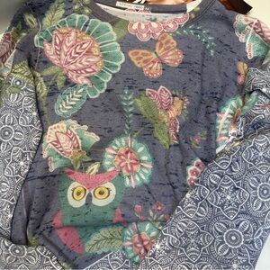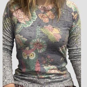 Embroidery inspired print pattern combines eclectic elements like a prominent owl, butterflies, and large floral motifs on the front, with intricate mandala-style geometric patterns on the sleeves and hem.