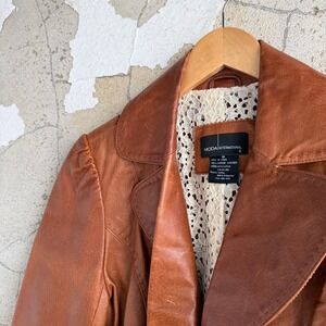 Vintage Y2K genuine leather blazer by Moda International for Victoria's Secret in a rich cognac brown and a feminine silhouette. Designed with a single-button closure, this jacket showcases intricate whipstitch detailing along the seams and a charming ruffled peplum-style ruffle hem at the back and sides. The interior is partially lined with a delicate cream lace, adding a romantic touch to the rugged leather exterior. Slight puff shoulders and a wide notched lapel.
