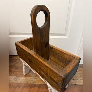 Charming vintage handmade wooden caddy with a warm, rustic finish and classic farmhouse appeal. This solid wood carry-all features a sturdy center handle with a hand-cut oval grip, giving it that authentic primitive, old-world look. The rich stained wood shows beautiful grain and natural wear, adding to its timeworn character and cozy cottage charm.