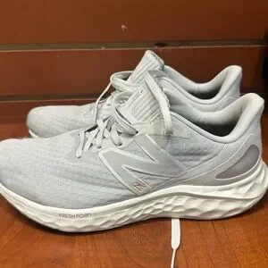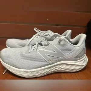 Light gray sneakers with Fresh Foam cushioning. Features New Balance logo. Ideal for running.
