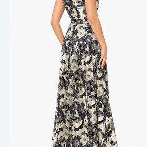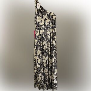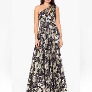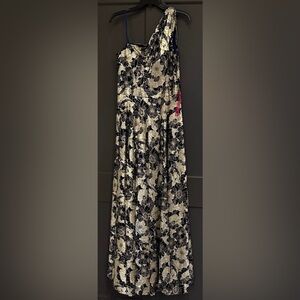 Betsy & Adam Navy and Gold Floral One-Shoulder Long Dress Gown Size 14 NWT