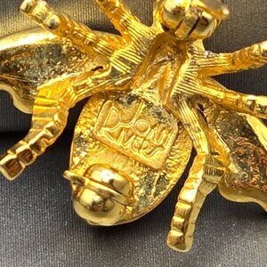 A striking vintage Joan Rivers bee brooch featuring clear crystal rhinestones and vibrant green eyes, set in a rich gold-tone finish. Signed and beautifully crafted, this whimsical insect pin adds sparkle and personality to any collection or outfit.
