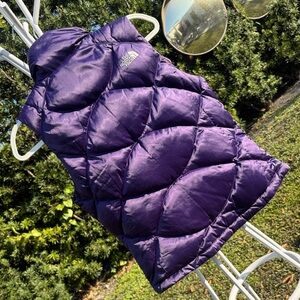 Quilted puffer vest by The North Face in deep metallic purple. No tags, but not certain my daughter ever even wore it. No flaws.