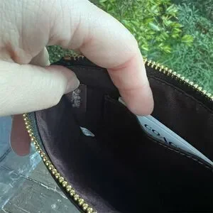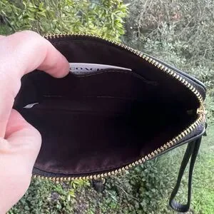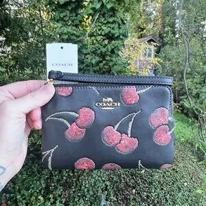 Keywords: Coach wristlet, women's fashion, black wristlet, cherry print, gold-tone hardware, detachable strap, quality materials, new with tags, women's accessories, Coach bag.