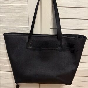 Chic black tote with gold logo accent. Perfect for daily use. Stylish and practical.