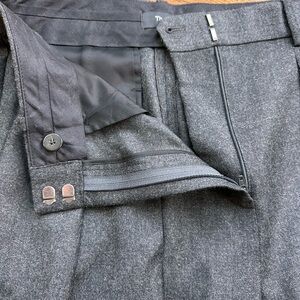 Theory trousers, virgin wool, career wear, pleated pants, tailored wide leg, minimalist chic, capsule wardrobe, office wear, charcoal slacks, flannel trousers, workwear pants, quiet luxury, high rise pleat pants