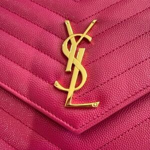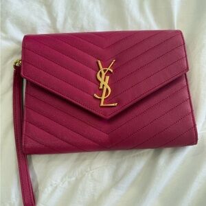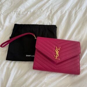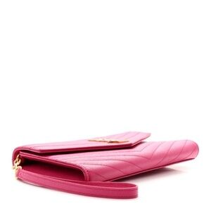 This is an authentic SAINT LAURENT Grain De Poudre Matelasse Chevron Monogram Envelope Clutch in Fuchsia. This elegant wallet is crafted of finely pebbled chevron-quilted leather in hot pink. The bag features a matching leather wristlet and a gold YSL logo. The front flap opens to a black fabric interior with a pocket.