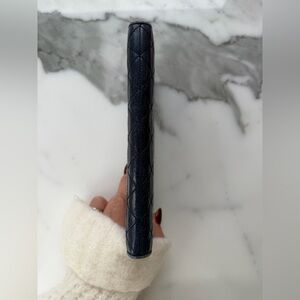Authentic Prada quilted leather zip-around continental long wallet in a rich dark navy blue. Features Prada’s signature diamond quilting, gold-tone Prada Milano triangle logo plaque, and a full zip-around closure.
