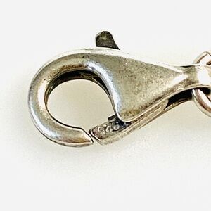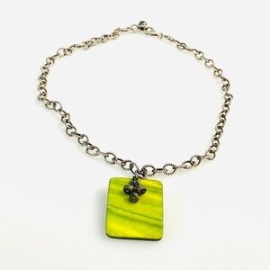 This sterling silver Silpada necklace features twisted rope chain with green mother-of-pearl rectangle pendant with green leather cording, pyrite beads, and an textured link chain 18”. This necklace N1133 is retired from 2008-3009 catalog page 50. It is in a very nice condition pre-owned condition. There is a tiny cheap on the bottom toward left corner of the pendant. Pendant Size: 1.25” by 1”. The chain is not magnetic and marked 925 on the lobster clasp. Please, see pictures for more details.