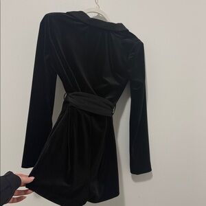 Luxurious black satin romper dress by Dynamite. Perfect for a comfortable and stylish night in.
