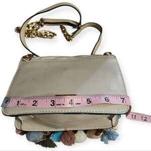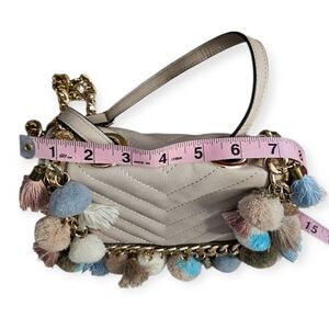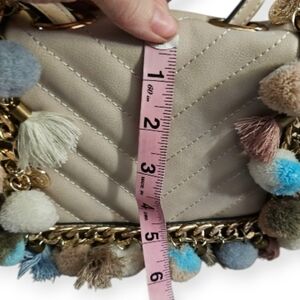 Stylish Aldo crossbody bag. Cream quilted design. Decorated with colorful pom poms. Perfect for any occasion. All measurements are in photos. Single button closure mini bag. Adjustable strap. Please see photos, some light staining on back of bag.