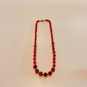 Vintage cherry red clip on earrings marked “West Germany” and unmarked necklace- necklace a little loose on string could use restrung.