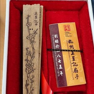 This elegant handcrafted fan features intricate designs in a beautiful tan color. Perfect for adding a touch of sophistication to any room.