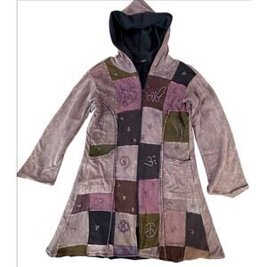 Vintage 90s Kathmandu Imports Boho Hippie Fairy Grunge Artsy Patchwork Hooded Zip Jacket Tunic Dress Size Large with Pockets Made in Nepal Whimsigoth Festival Pixie Coat