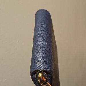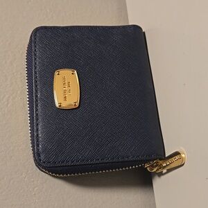 Chic Michael Kors wallet in dark blue. Features luxurious gold accents. Ideal for essentials.