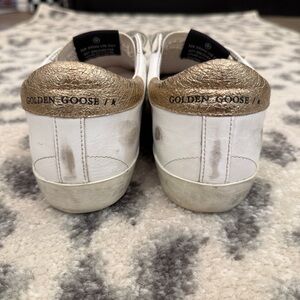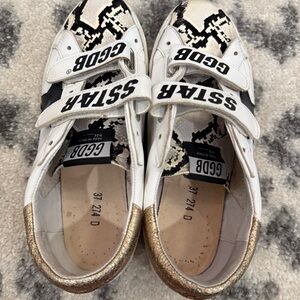 Stylish Golden Goose sneakers. White base with black star and accents. Velcro straps for easy wear. Perfect for casual outings.