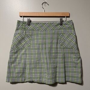 Stylish green plaid skort perfect for outdoor activities. Front pleats. Front functional pockets. Back zipper and double button closure. Interior shorts. Slight stretch. Quick dry water repellent material. Like new condition.
