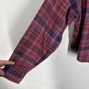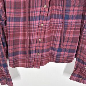 American Eagle Women S Burgundy Plaid Distressed Cropped Hooded Flannel Shirt
