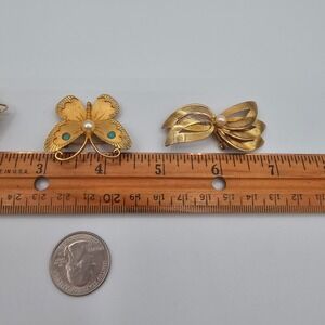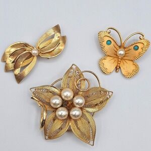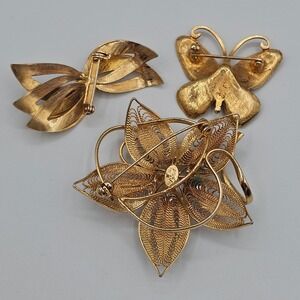 Vtg Set of 3 Vtg Gold Tone Brooches Filigree Flower Butterfly Bow Pins Elegant
