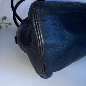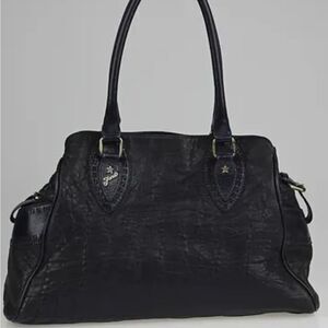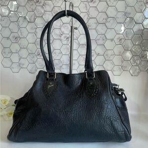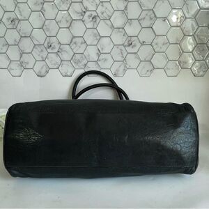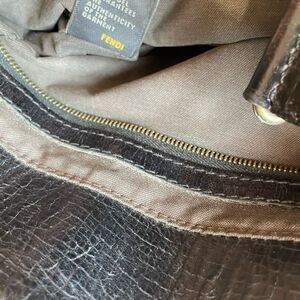 Gorgeous black leather satchel with rolled handles and signature Fendi hardware. Features accordion sides, gold-tone details, and a spacious fabric-lined interior with zip pocket. Includes interior serial number. Made in Italy.